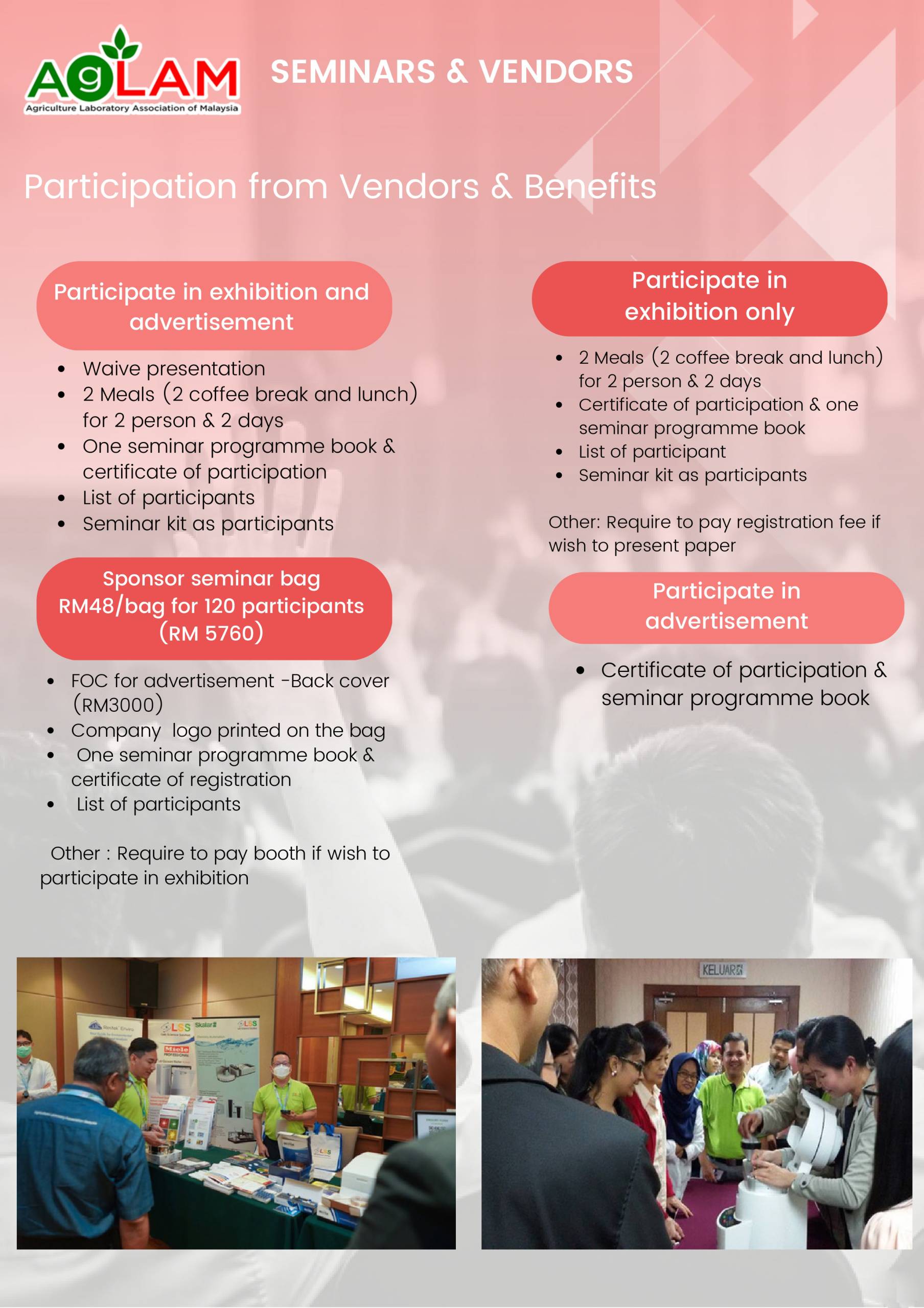 AgLAM conducts proficiency testing for 3 rounds per year with participants ranging from plantation companies, university, government, commercial company and commercial laboratories. 3 meetings are conducted every year at selected venues to discuss on the programme.